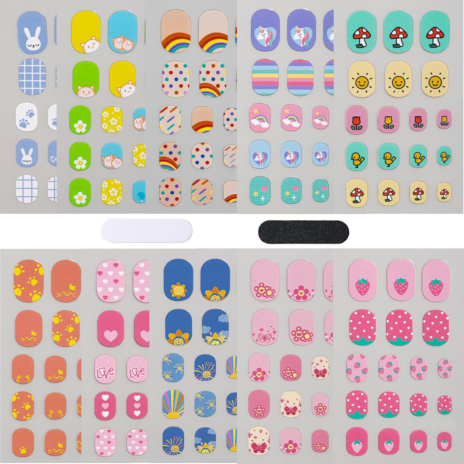 The nail wrap stickers have 10 different cute designs of flowers rainbow rabbit cat sun strawberry heart that kids will like